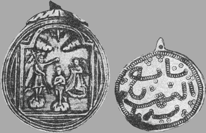 Амулеты из перламутра. На первом изображено крещение Иисуса Иоанном Крестителем; второй носили одинокие девушки, чтобы сохранить целомудрие до брака и быстрее найти мужа