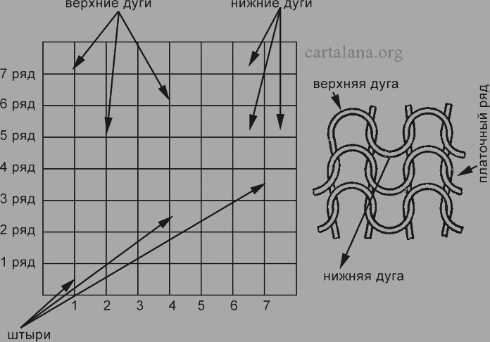 На рис. 175 подана сетка, в которой указывается расположение верхних и нижних петельных дуг и число рядов платочной вязки.