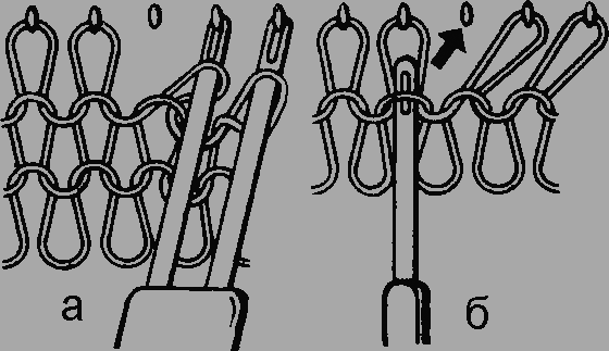 Рис. 14. Прибавление петель с края полотна: а - одна иголка свободна, двухигольный деккер надет на крючки; б - заполнение свободной иглы петлей из нижнего ряда